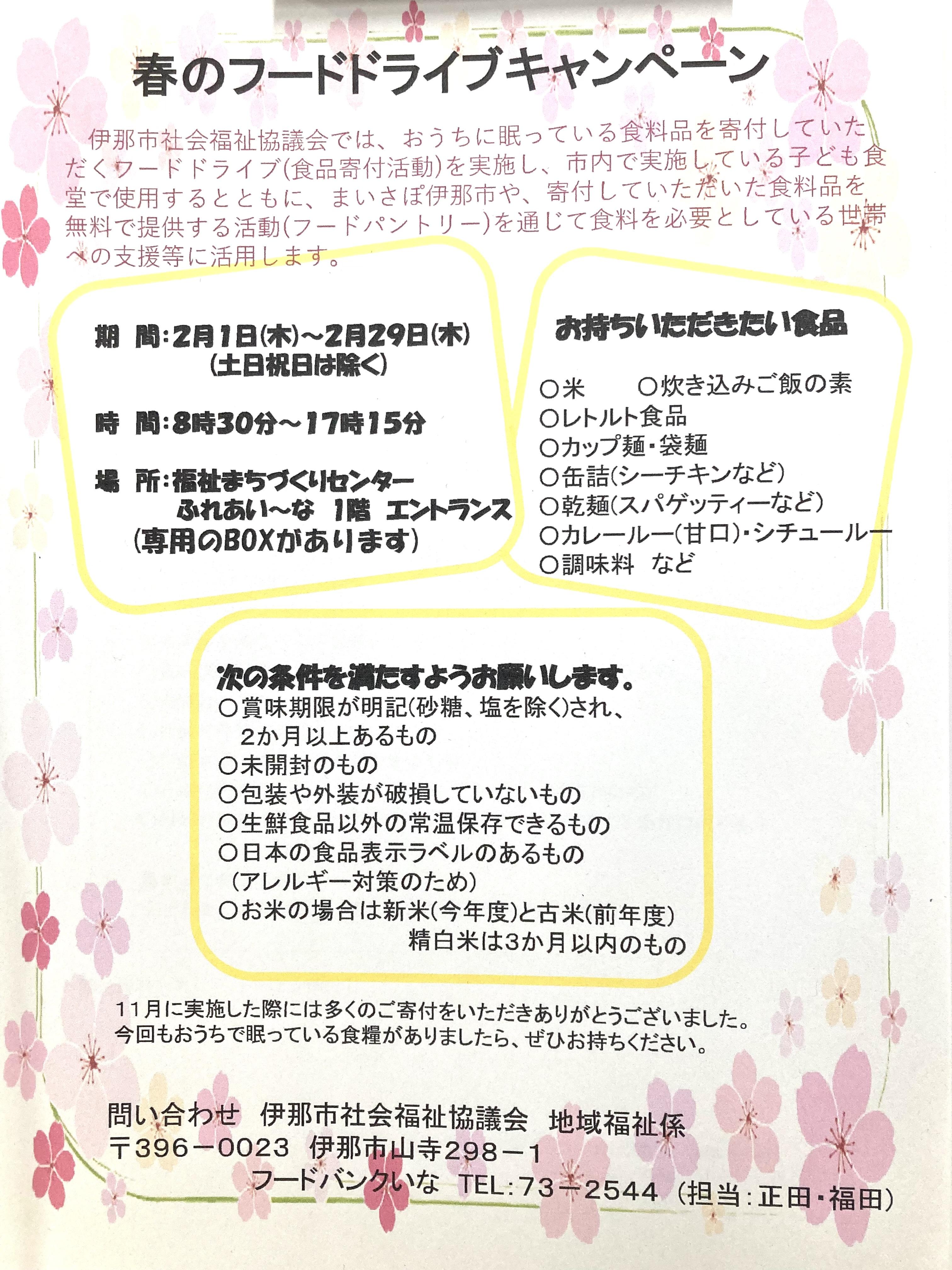 下記の通り春のフードドライブキャンペーンを実施しますので、